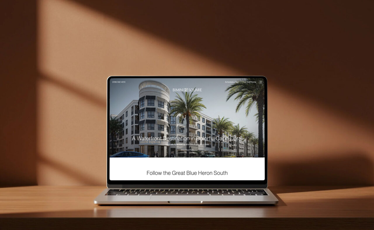 Our marketing plan carried that identity into every channel. The new website balanced aspiration with utility, while signage and collateral reinforced the sense of place. Direct mail supported targeted search, paid social and display ads to build awareness and generate qualified leads, while organic social media and email marketing nurtured those leads and told the ongoing story of life at Bimini Square to high-intent audiences. Every tactic worked together to support a curated lead-nurture process that positioned Bimini Square for a successful lease-up, despite still being under construction.